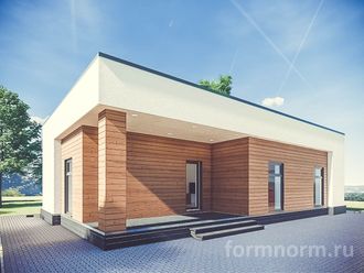 Современный коттедж с двумя спальнями и отдельным выходом на террасу. В основе простая форма, раскрытая через фактуру и цвет отделочных материалов — белой фасадной штукатурки и тонированного планкена.